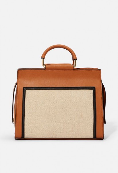 Material: Linen/Faux Leather Size: 12”L x 10”H x 5.5”D Hardware color: Gold Handle drop measurement : 3" Removable Adjustable Shoulder Strap Pockets: 1 interior pocket, 1 interior zip Closure: Zipper