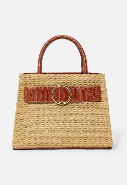 Material: Straw/Faux Leather Size: 13”L x 10”H x 7”D Hardware color: Gold Handle drop measurement : 5" Removable Adjustable Shoulder Strap Pockets: 1 interior pocket, 1 interior zip Closure: Magnetic snap